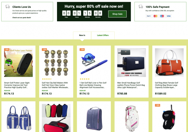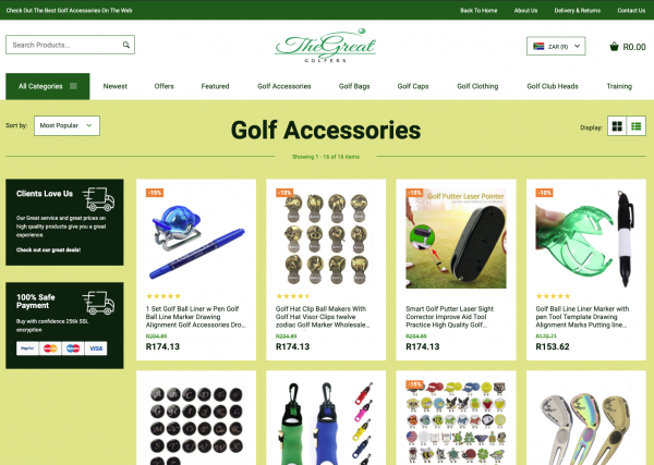 A fantastic Golf and Accessories store with over 300 products with multiple product categories including golf clubs, golf gloves, golf clothes, golf caps and accessories through your dropshipping store, with all the products hand chosen to complement each other without them being overly available in the local market to ensure you keep your edge of uniqueness, with worldwide delivery.