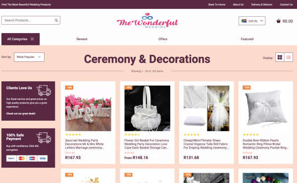 Selling the latest and most beautiful wedding and prom products through your dropshipping store, with all the products hand chosen to complement each other without them being overly available in the local market to ensure you keep your edge of uniqueness, with worldwide delivery.