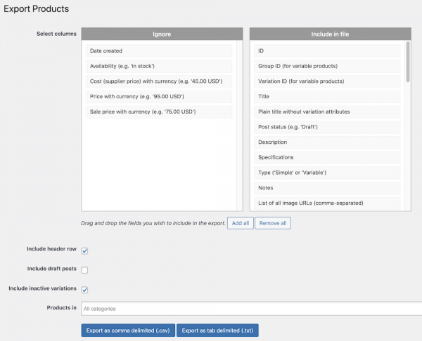 - Include all products or choose by category which to include in the file